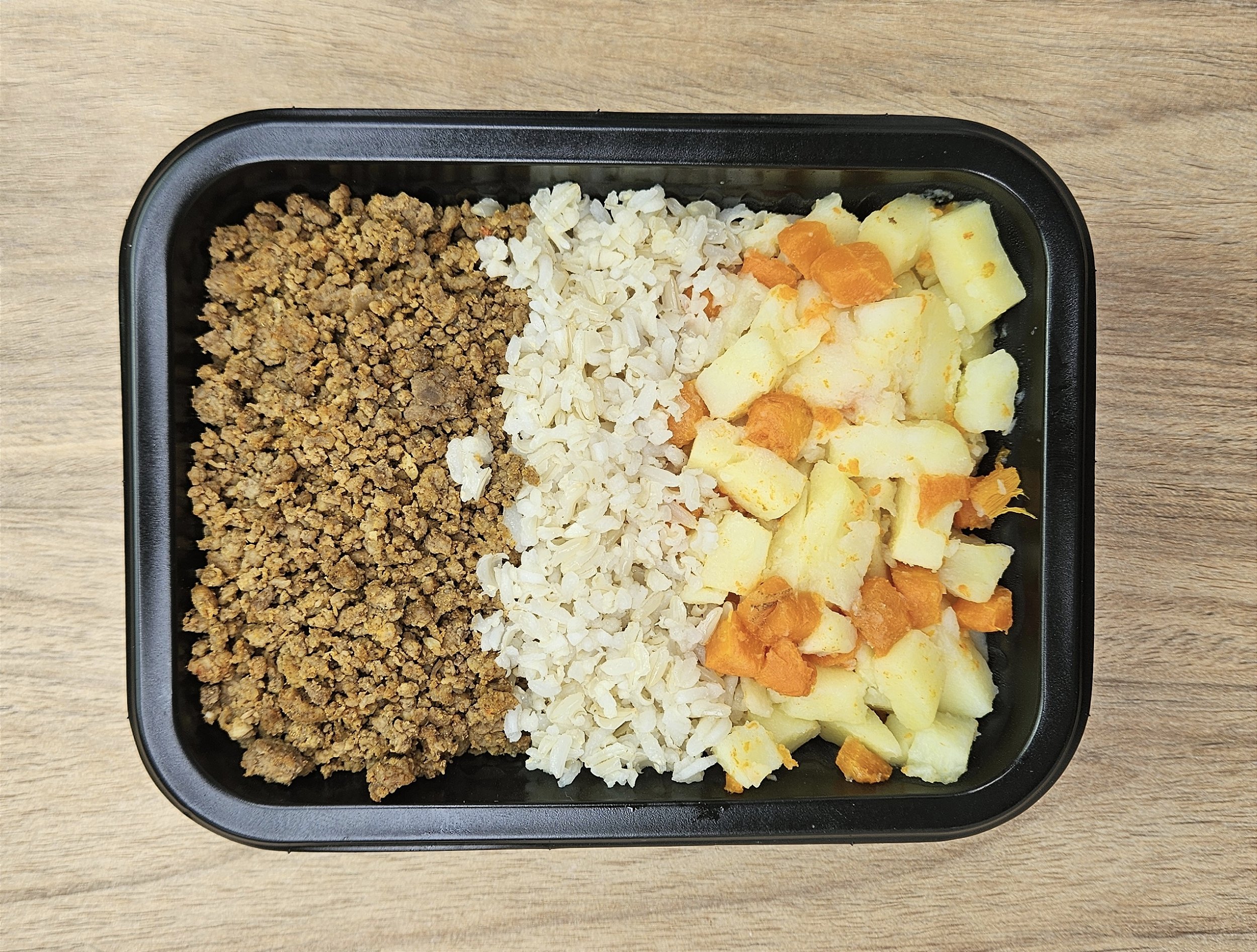 Arroz integral, carne moída refogada e mix de legumes (vagem com cenoura).
