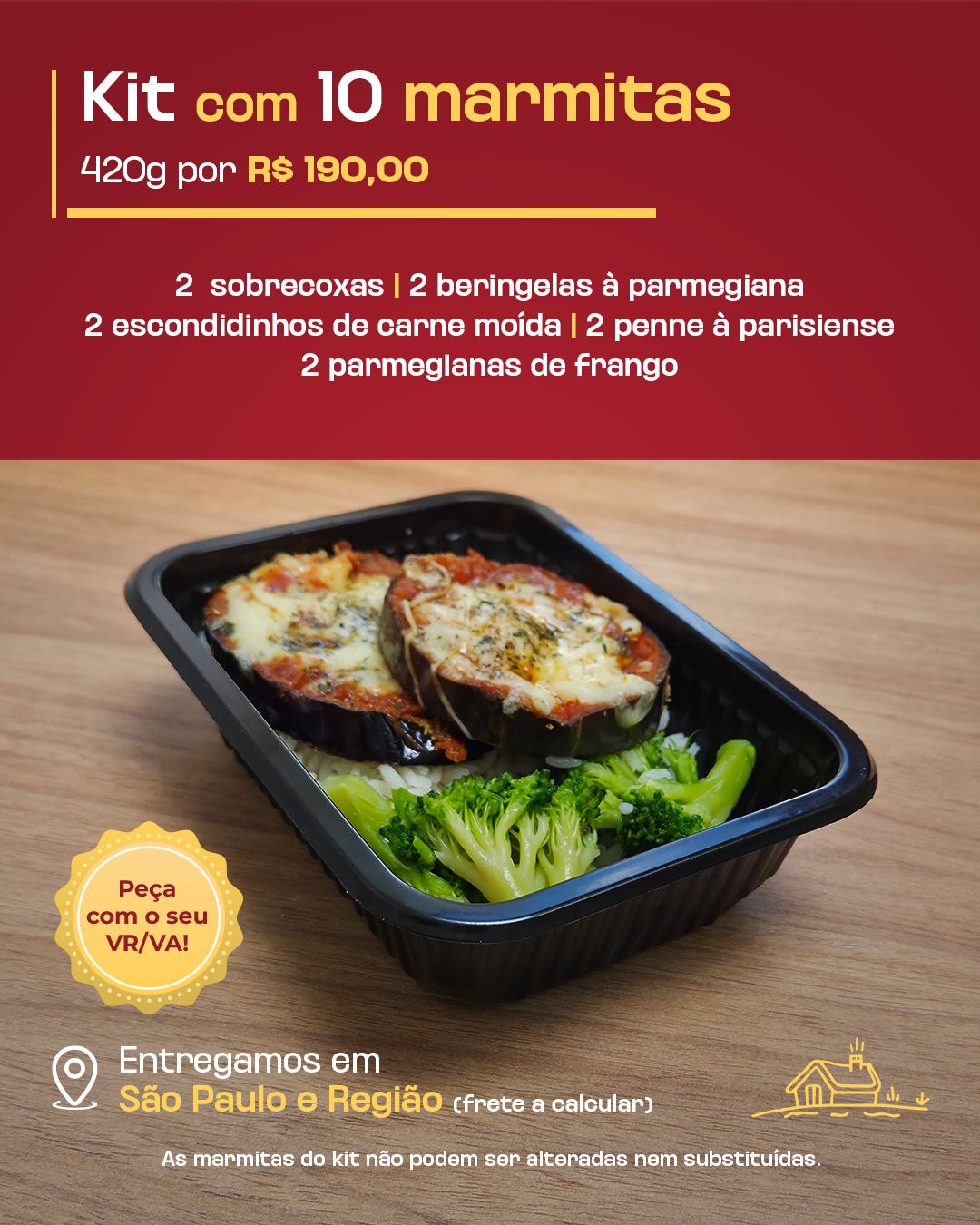 2x escondidinhos de carne moída. 2x macarrão penne à parisiense. 2x parmegiana de frango.